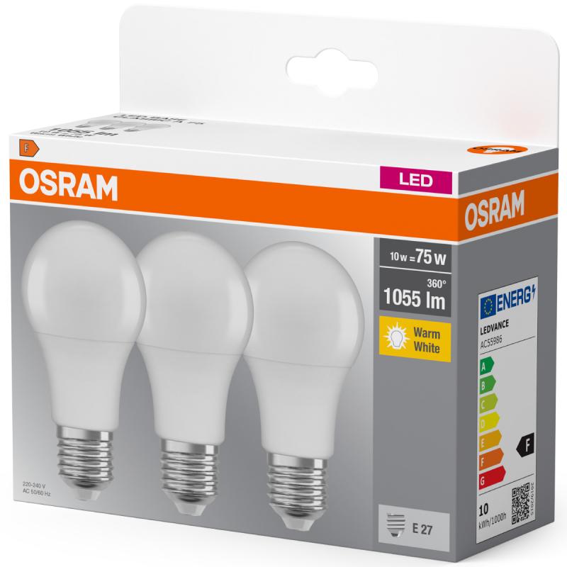 Osram A60 bumbierveida formas LED spuldze ar E27 ligzdu izstaro silti baltu gaismu, kas piemērota ikdienas apgaismojumam dzīvojamās telpās. Tās gaismas plūsma ir 1055 lūmeni un enerģijas patēriņš ir 10 W. Tā sniedz spilgtumu, kas atbilst 75 W kvēlspuldzei. Matētais pārklājums palīdz vienmērīgi izkliedēt gaismu, samazinot atspīdumu. Spuldzes izmērs (D x A) 60 x 109 mm. Komplektā 3 gb.