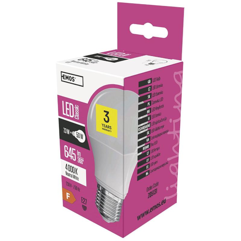 EMOS A60 bumbierveida formas LED spuldze ar E27 ligzdu izstaro neitrāli baltu gaismu, kas piemērota ikdienas apgaismojumam dzīvojamās telpās. Tās gaismas plūsma ir 645 lūmeni un enerģijas patēriņš ir 8 W. Tā sniedz spilgtumu, kas atbilst 50 W kvēlspuldzei. Matētais pārklājums palīdz vienmērīgi izkliedēt gaismu, samazinot atspīdumu. Spuldzes izmērs (D x A) 60 x 110 mm.
