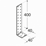 Leņķi koksnes enkurošanai betonā. Tos izmanto stabu, siju un augšējo plākšņu nostiprināšanai. Izgatavoti no cinkota tērauda DX51D + Z275, biezums 2 mm. Piemērotie stiprinājumi - galdniecības enkurnaglas ø 4 mm, kokskrūves ø 4 mm, ø 8 mm, ø 12 mm, skrūves M8, M12, betona enkuri M8, M12. Nestspēja un noturība 14.26 kN. Izmērs 40 x 40 x 400 x 2 mm.