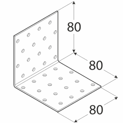 Plati leņķi ar daudzpusīgu perforāciju. Tajos ievietoto atveru skaits nodrošina, ka šie leņķi palīdz izveidot daudzus vienkāršus, kā arī sarežģītus savienojumus. Izgatavoti no cinkota tērauda DX51D + Z275, biezums 2 mm. Piemērotie stiprinājumi - galdniecības enkurnaglas ø 4 mm. Nestspēja un noturība 8.64 kN. Izmērs 80 x 80 x 80 x 2 mm.