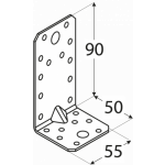 Pastiprināti leņķi ar ļoti augsta lieces izturība. Tiem ir plaša perforācija, kas ļauj tos izmantot gan standarta, gan nestandarta risinājumos. Izgatavoti no cinkota tērauda DX51D + Z275, biezums 2.5 mm. Piemērotie stiprinājumi - galdniecības enkurnaglas ø 4 mm, kokskrūves ø 6 mm, ø 10 mm, skrūves M10, M12, betona enkuri M10, M12. Nestspēja un noturība 14.35 kN. Izmērs 50 x 55 x 90 x 2.5 mm.
