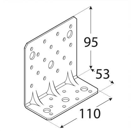 Eirokodeksa prasībām pielāgoti pastiprināti leņķi, kuriem ir minimālas atstarpes starp naglām. Tiem ir plaša perforācija, tāpēc tos var izmantot gan standarta, gan nestandarta risinājumos. Izgatavoti no cinkota tērauda DX51D + Z275, biezums 2.5 mm. Piemērotie stiprinājumi - galdniecības enkurnaglas ø 4 mm, kokskrūves ø 6 mm, ø 10 mm, skrūves M6, M10, betona enkuri M6, M10. Nestspēja un noturība 16.7 kN. Izmērs 53 x 110 x 95 x 2.5 mm.