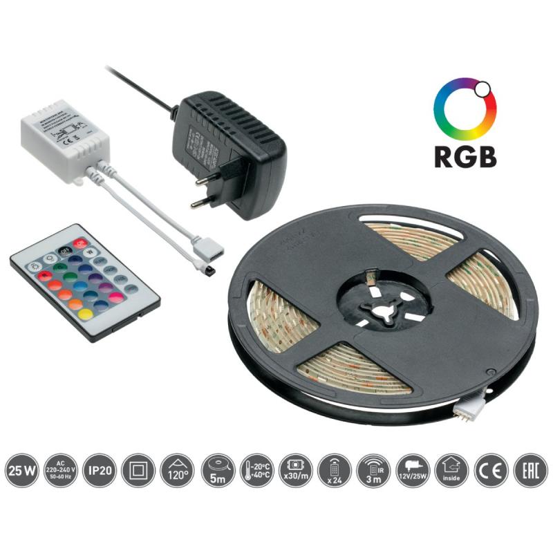 GTV LED lente RGB ir pilns apgaismojuma komplekts ar iekļautu barošanas bloku, kontrolieri un pulti, kas nodrošina plašas iespējas telpu dekoratīvai izgaismošanai. Tas ir gatavs lietošanai uzreiz pēc izpakošanas un, pateicoties elastīgajai 5 metru LED lentei, to var ērti pielāgot mēbelēm, nišām, plauktiem vai citiem interjera akcentiem. RGB tehnoloģija ļauj veidot daudzkrāsainu apgaismojumu, apvienojot sarkano, zaļo un zilo gaismu, kā arī radīt dažādus starptoņu efektus līdz pat baltajai gaismai. Komplektā iekļautā IR pults nodrošina ērtu attālinātu vadību, ļaujot regulēt gan spilgtumu, gan izvēlēties pamatkrāsas vai to miksētos toņus. Papildus tam pieejami četri iepriekš iestatīti gaismas efekti, kas rada dinamiskus vai plūstošus pārejas efektus. Tas sniedz iespēju radīt īpašu noskaņu, sākot no intensīvas ballīšu atmosfēras līdz pat maigi izgaismotam vakara režīmam. Lentei ir 30 diodes uz metru, kas nodrošina vienmērīgu gaismas izkliedi un estētisku vizuālo rezultātu. Lietotājam nav nepieciešamas papildu