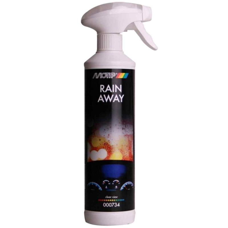 Izvairieties no lietus uz automašīnas logiem un spoguļiem, izmantojot Motip Rain Away. Var izmantot arī, lai atvairītu lietu no ķiveres viziera vai motorollera vējstikla. Motip Rain Away samazina netīrumu saķeri un satur silikonus. Rūpīgi notīriet virsmu ar stikla tīrīšanas līdzekli. Uzklājiet Rain Away un vienmērīgi izplatiet ar sausu drānu vai salvešu papīru. Pēc tam nopulējiet ar sausu drānu, līdz nepaliek svītras.