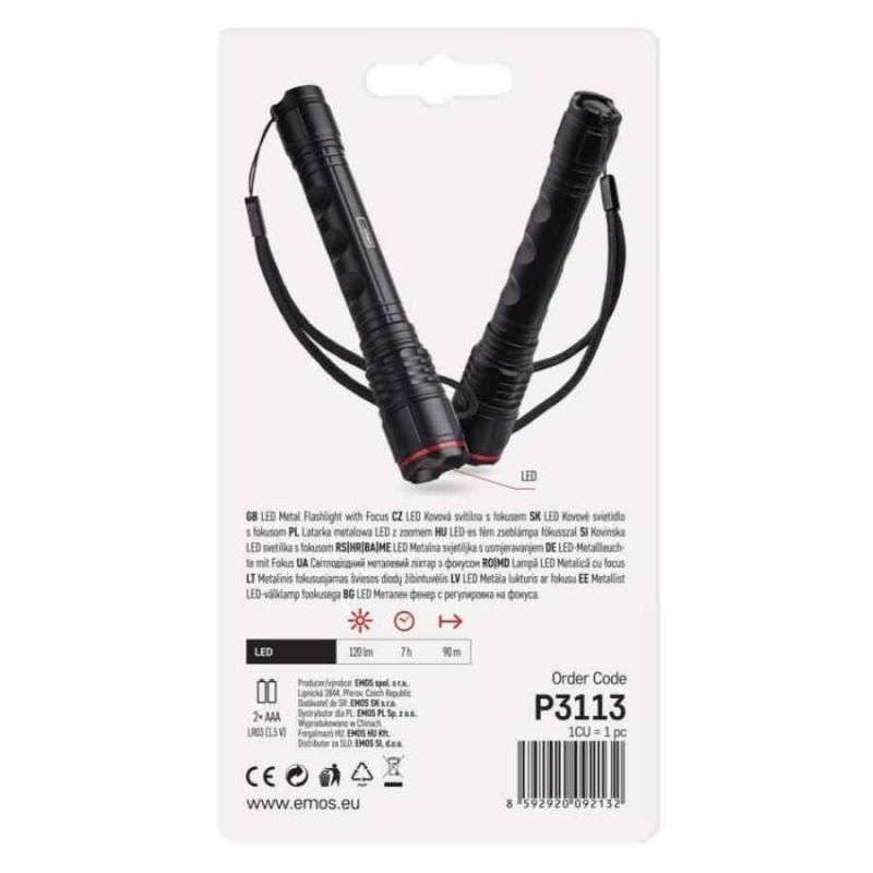 Emos LED lukturis P3113 ir kompakts un izturīgs apgaismojums ar maksimālo gaismas plūsmu 120 lm un apgaismojuma attālumu līdz 90 metriem. Darbojas ar 2 x AAA baterijām, nodrošinot līdz 7 stundām nepārtrauktas gaismas. Alumīnija korpuss un IP44 aizsardzība pret ūdens šļakatām padara to piemērotu dažādiem āra un ikdienas darbiem. Lukturis nodrošina vienu gaismas režīmu ar regulējamu fokusēšanu (zoom), kā arī ir viegls un ērti pārnēsājams ar pievienotu cilpu.