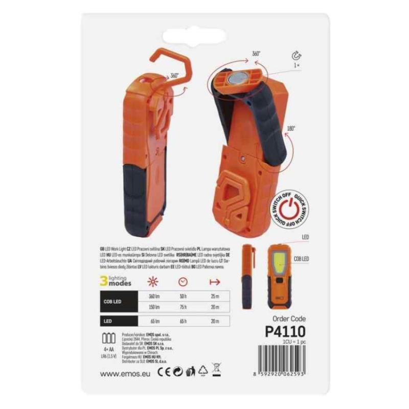 EMOS P4110 ir kompakts un efektīvs LED lukturis ar 5 W jaudu, kas darbojas ar 4 × AA baterijām. Tā kombinētais LED un COB LED apgaismojums nodrošina spilgtu 360 lm gaismu un līdz pat 50 stundu darbības laiku pie pilnas jaudas. Lukturim ir trīs apgaismojuma režīmi, ieskaitot COB LED 100 %, COB LED 50 % un tradicionālo LED režīmu, kā arī ērta ātrās izslēgšanas funkcija. Izturīgā ABS plastmasas un gumijas konstrukcija ir noturīga pret triecieniem un to papildina praktisks salokāms rokturis, āķis un magnēts, kas ļauj to ērti novietot jebkurā vietā.