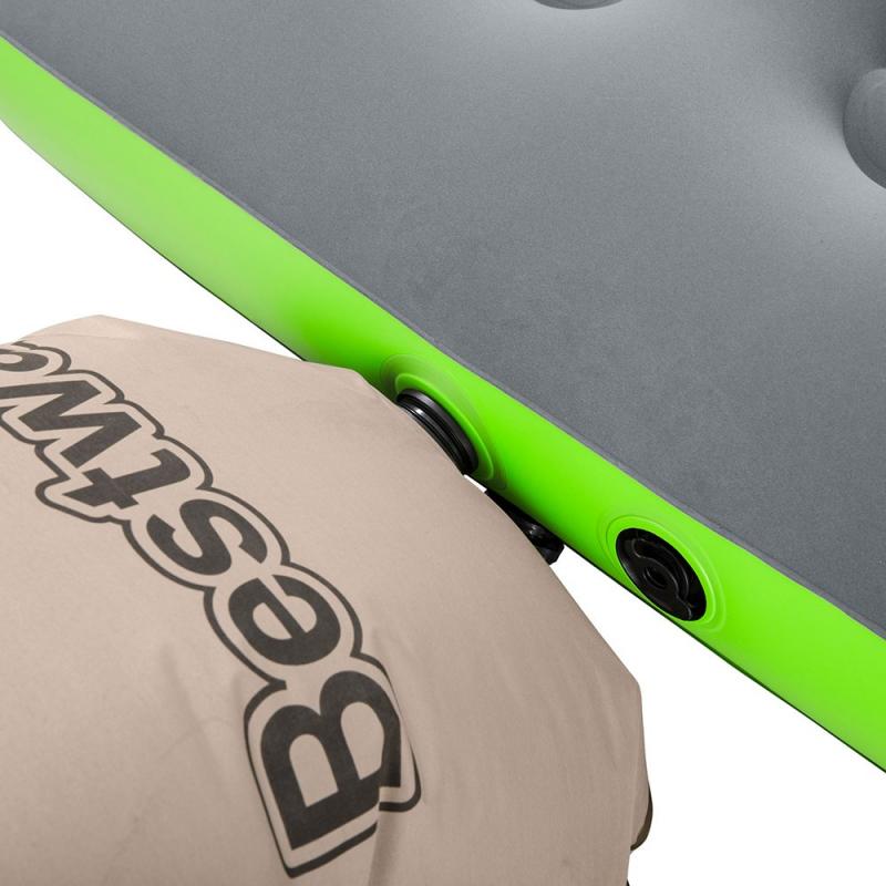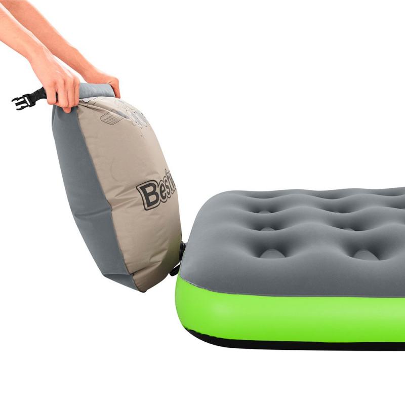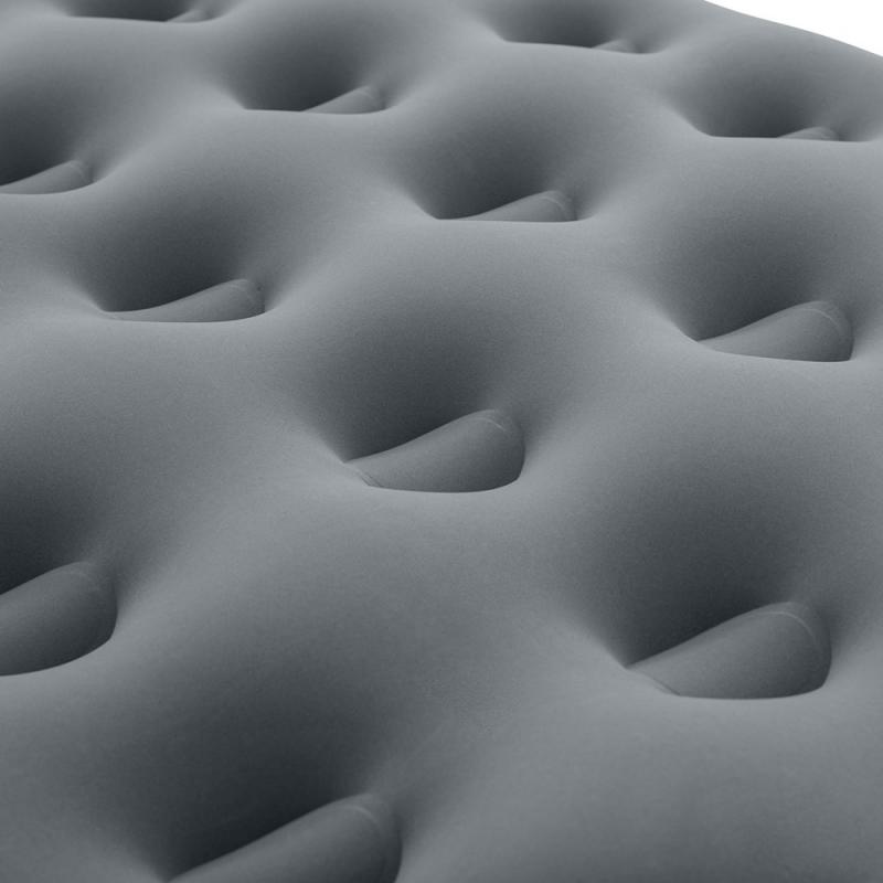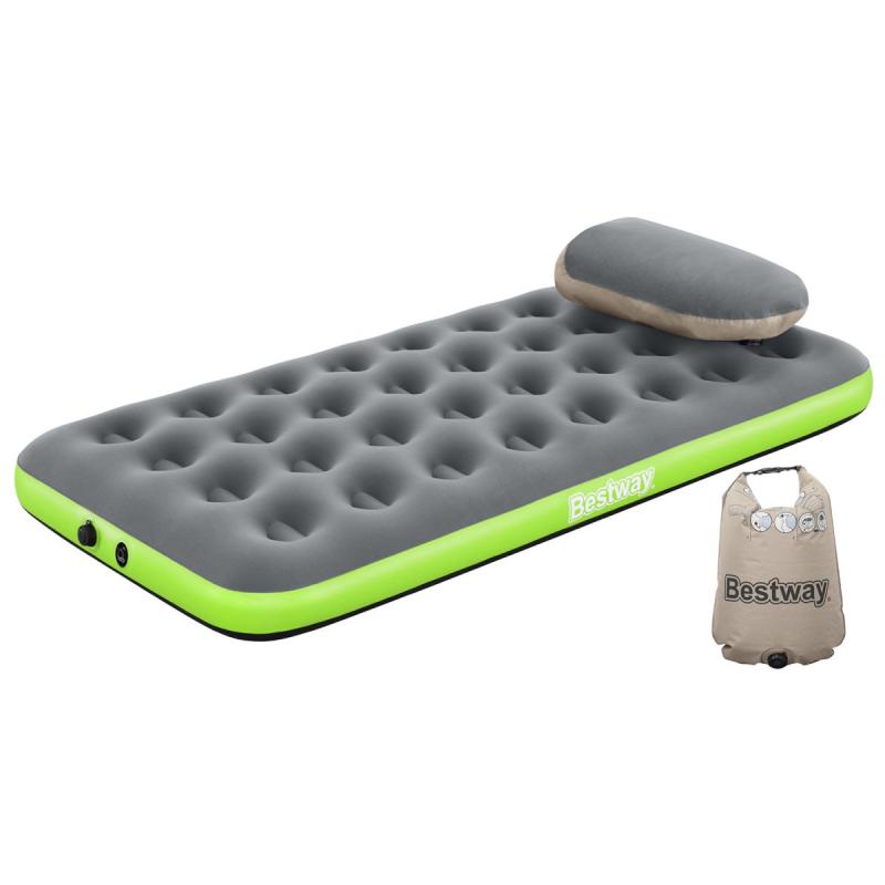 Piepūšams vinila matracis ar Aircinch™ kompresijas maisu, kas darbojas kā pārnēsāšanas soma un spilvens. Lai piepūstu matraci, izņemiet to no somas un pievienojiet Aircinch kompresijas maisa vārstam. Atveriet maisu un šūpojiet to uz augšu un uz leju, lai uzņemtu pēc iespējas vairāk gaisa. Pēc tam saspiediet maisa atvērto galu, lai notvertu tajā esošo gaisu. Saspiediet maisu, lai gaiss varētu izplūst un iekļūt matracī. Atkārtojiet procesu, līdz tiek sasniegts nepieciešamais uzpildes līmenis. Iztukšojot matraci, varat to ievietot atpakaļ AirCinch somiņā transportēšanai un uzglabāšanai. Matrača garums 188 cm, platums 99 cm, augstums 22 cm, svars 4 kg. Komplektā ietilpst ielāps remontam.