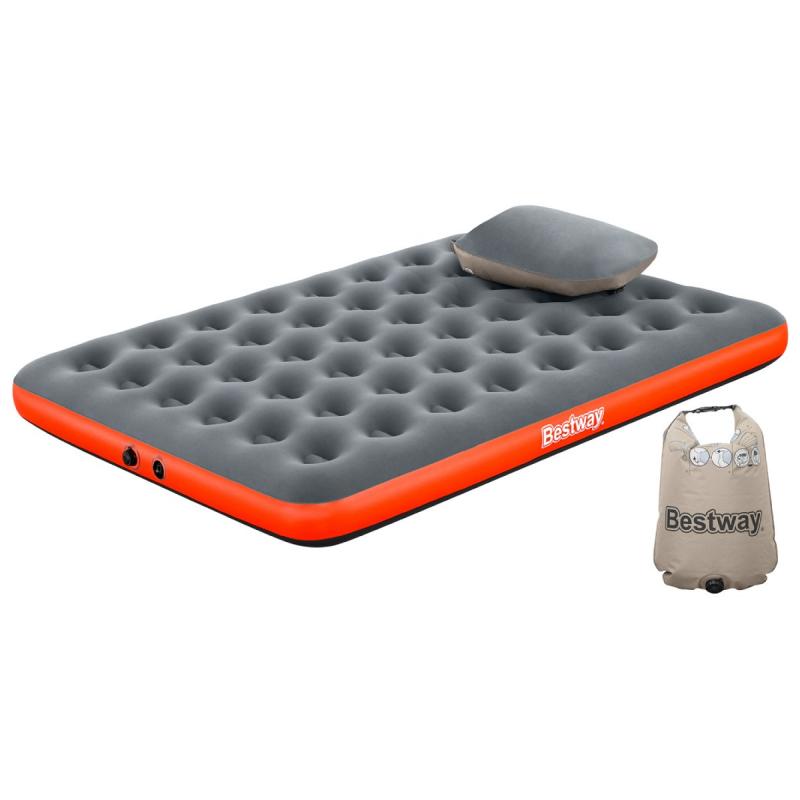 Bestway® Roll & Relax™ piepūšamais matracis ir lieliski piemērots āra ceļojumiem. Izmantojot šo novatorisko matraci, nav jānēsā papildu gaisa pumpis. Iekļautais AirCinch™ pumpis piepūš matraci ar aptuveni 12 – 14 saspiešanas reizēm un darbojas kā ērta pārnēsāšanas soma. Kad esat gatavs piepūst matraci, vienkārši izņemiet to no pārnēsāšanas somas un pievienojiet maisu lielajam divvirzienu ātrās atbrīvošanas vārstam. Atveriet maisu un piepildiet to ar gaisu, atkārtoti šūpojot. Saspiediet maisa atvērto galu, lai tas noslēgtos gaisā. Saspiediet maisu, lai iespiestu gaisu matracī, un atkārtojiet, līdz tiek sasniegta vēlamā stingrība. Šis matracis nodrošina komfortu, kas nepieciešams mierīgam nakts miegam. Ērtā gulēšanas virsma kombinācijā ar iekšējām siksnām piešķir standarta matrača sajūtu. Matrača konstrukciju ātri reaģē uz ķermeņa kustībām.