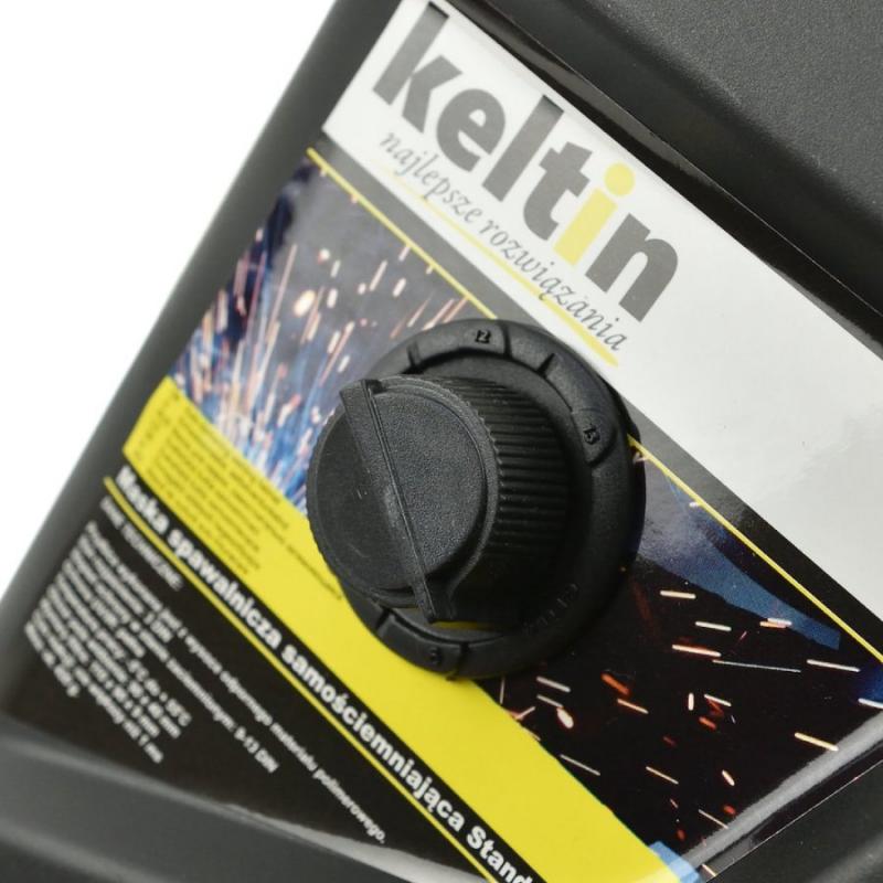 KELTIN automātiski aptumšojoša metināšanas maska. Paredzēta, lai metināšanas laikā aizsargātu acis un seju pret dzirkstelēm, šļakatām un kaitīgo UV un IR starojumu. Maska ir piemērota metināšanai ar visām metodēm, izmantojot elektrisko loku - ar pārklātu elektrodu MMA un pusautomātisko MIG-MAG un TIG gāzes vairogu. Turklāt ir iespējams arī metināt ar TIG (-) metodi - vājstrāva (20 A). Filtra kasetē ir divi fotosensori, kas reaģē uz metināšanas loka gaismu, kas automātiski identificē metināšanas sākumu un aktivizē pašiztumšošanas funkciju. Pēc darba pabeigšanas filtrs automātiski atgriežas apgaismojuma stāvoklī. Automātiskās aptumšošanas filtram ir divi neatkarīgi barošanas avoti - iebūvēts akumulators, ko darbina saules baterijas, un 2 x AAA baterijas. Iespēja pielāgot parametrus un maskas izmēru, ļauj pareizi pielāgot produktu darba veidam un klientu vēlmēm.
