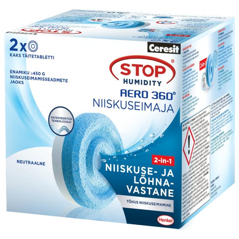 Mitruma savācēja Ceresit AERO 360° uzpildes tablete. Ideāli piemērots lietošanai telpās līdz 20 m2. AERO 360° sistēma absorbē lieko mitrumu no gaisa un neitralizē nepatīkamās smakas ar unikālas 360° gaisa cirkulācijas palīdzību. AERO 360° tablete pārvērš mitrumu sāls šķīdumā, sāls šķīdums uzkrājas apakšējā traukā. Nav nepieciešama elektrība. Videi draudzīgs un ērts - produktu atliekas var izliet kanalizācijas sistēmā.