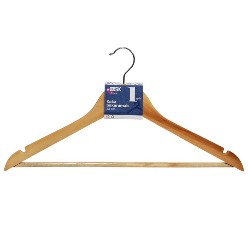 BESK koka pakaramais ir izturīgs un praktisks risinājums apģērbu kārtošanai skapī. Šis pakaramais izgatavots no kvalitatīva koka un aprīkots ar metāla āķi, ko var pagriezt par 360 grādiem, nodrošinot ērtu lietošanu jebkurā vietā. Platums 44 cm ļauj pakarināt gan kreklus, gan bikses, saglabājot apģērba formu un kārtību. Pakaramajam ir īpaši izgriezumi, lai apģērbi nenoslīdētu.