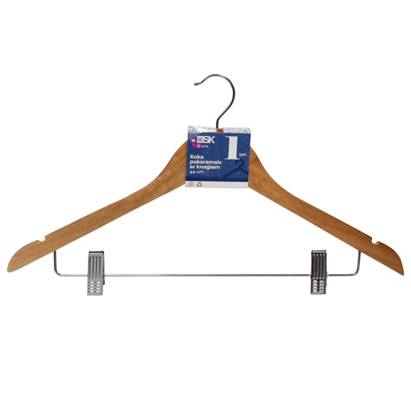 Besk koka pakaramais ar knaģiem ir praktisks un izturīgs risinājums gan ikdienas, gan svētku apģērba kārtīgai uzglabāšanai skapī. Gaiši brūnais koka pakaramais ar metāla āķi piešķir garderobei klasiski estētisku izskatu, vienlaikus nodrošinot stabilu atbalstu jakām, krekliem un mēteļiem. Apakšējais metāla stienis ar regulējamiem knaģiem ir īpaši ērts biksēm, svārkiem un citiem apģērbiem, ko nepieciešams pakarināt, nelocot audumu. Metāla āķi iespējams pagriezt par 360 grādiem, tāpēc pakaramais ir viegli pielāgojams dažāda veida skapjiem un drēbju stangām, padarot apģērbu organizēšanu ērtāku un pārskatāmāku. Platums 44 cm.