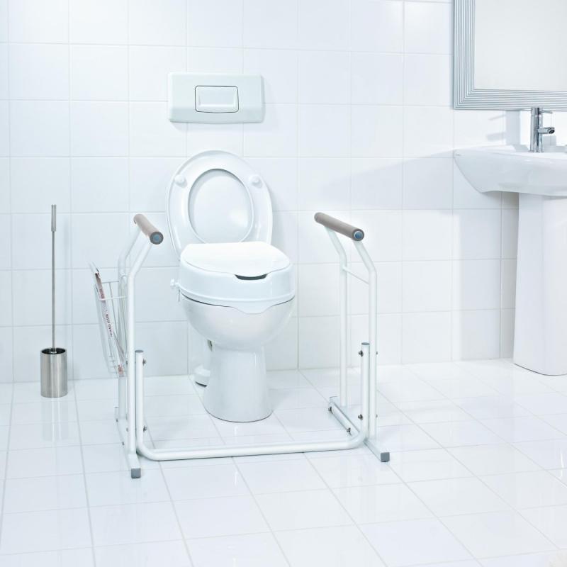RIDDER tualetes papildierīce ir paredzēta, lai atvieglotu piecelšanos un apsēšanos uz tualetes cilvēkiem ar ierobežotām pārvietošanās spējām. Šī palīglīdzekļa dizains nodrošina papildu atbalstu un stabilitāti, samazinot slodzi uz kājām un muguru. Ierīce ir brīvi stāvoša, tādēļ to var pārvietot pēc vajadzības un tai nav nepieciešama sarežģīta uzstādīšana vai urbšana. Gumijas uzgaļi apakšā pasargā grīdu no skrāpējumiem un nodrošina, ka ierīce neslīd. Ergonomiskie rokturi ir izgatavoti no mīksta putu materiāla, kas nodrošina drošu un ērtu satvērienu. Papildierīce ir aprīkota ar rokturiem, kā arī grozu žurnāliem vai citiem priekšmetiem. Tā ir viegli tīrāma ar standarta tīrīšanas un dezinfekcijas līdzekļiem.