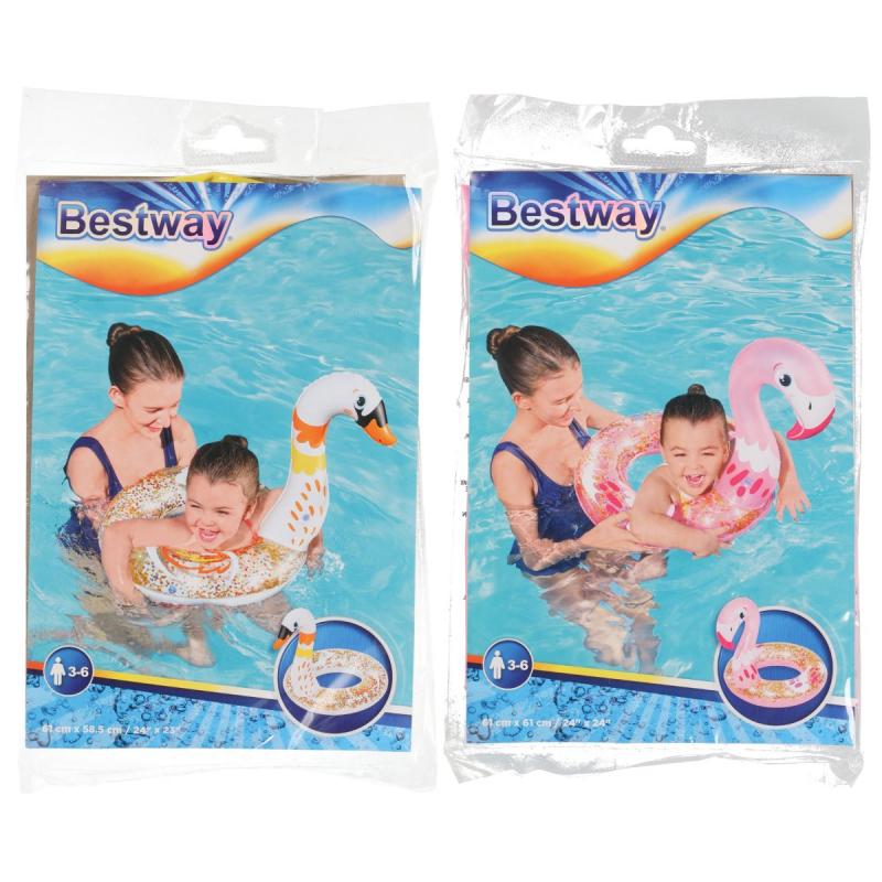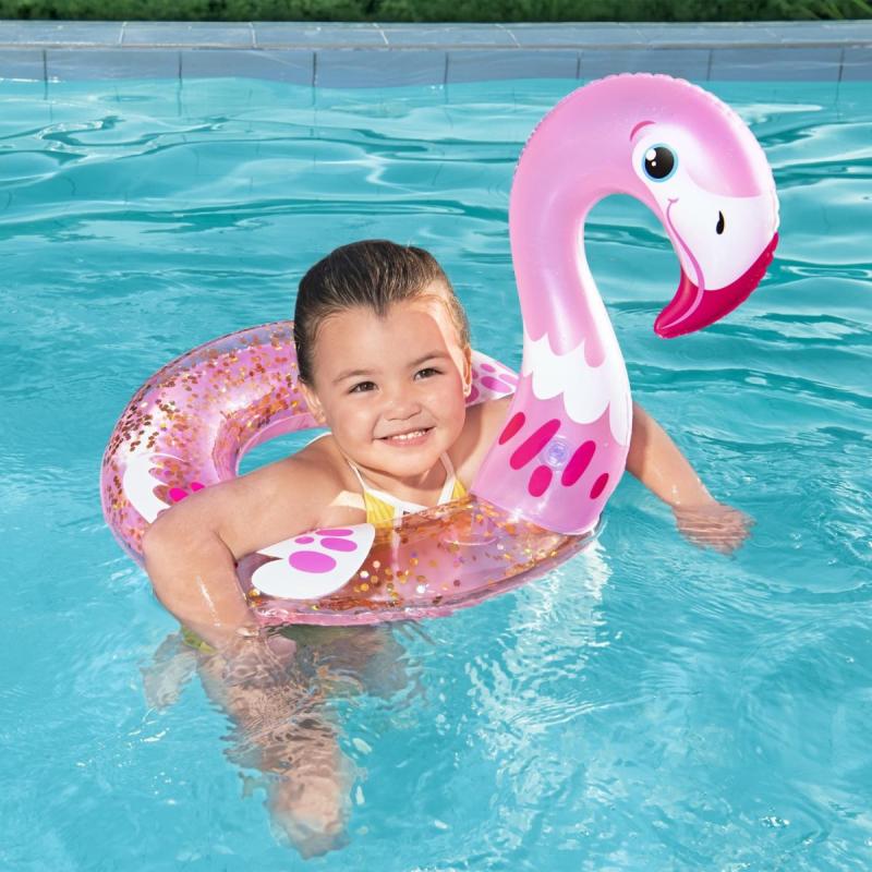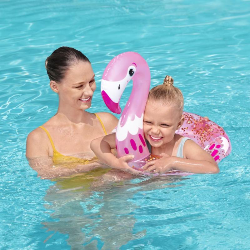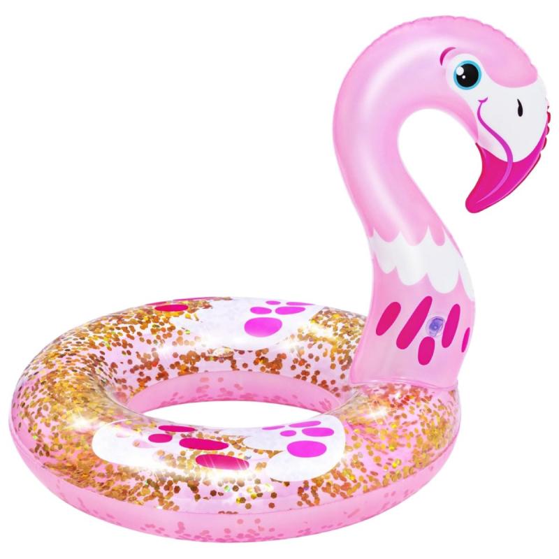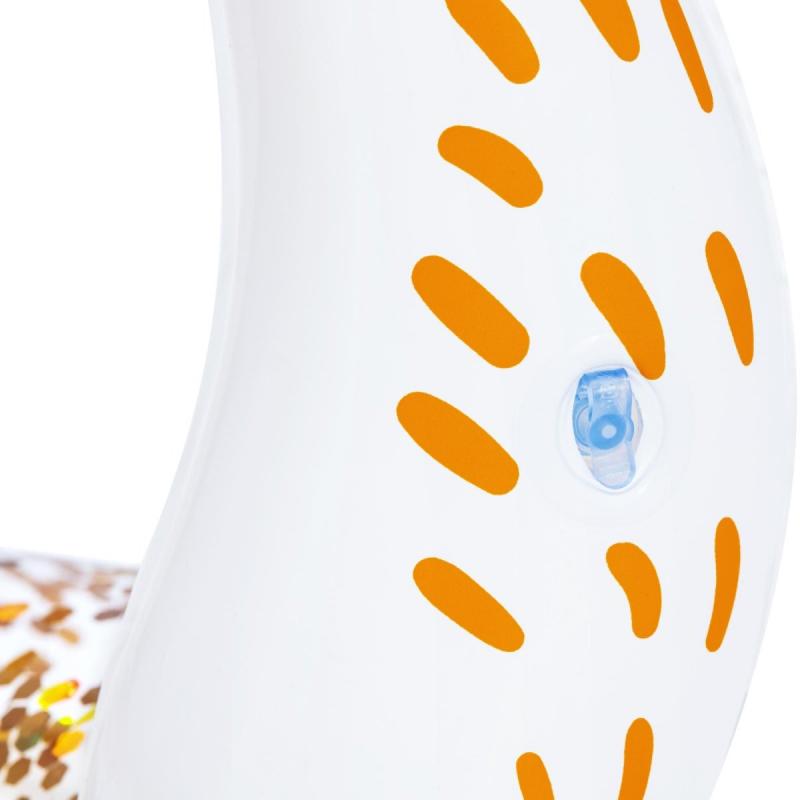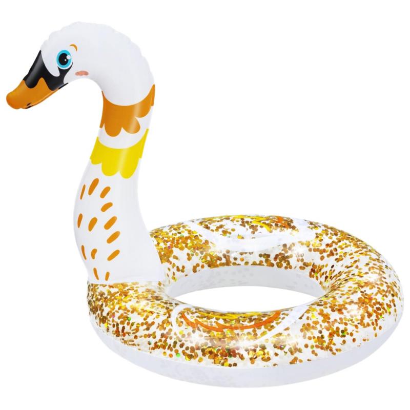Peldriņķis ir aprīkots ar 2 gaisa kamerām, kas ievērojami atvieglo piepūšanu un deflāciju. Izgatavots no iepriekš pārbaudīta, izturīga materiāla, lai nodrošinātu peldriņķa izturību vairākas vasaras. Putna garais, elegantais kakls ir lieliski piemērots, lai turētos vai atspiestos. Peldriņķis ir piepildīts ar mirdzošiem spīdumiem.