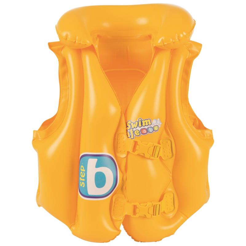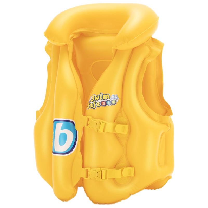 Swim Safe ABC™ Baby piepūšamā veste. Šai vestei ir 3 gaisa kameras un piepūšama apkakle, lai palielinātu peldspēju un 2 regulējamas, ātri atvienojamas sprādzes drošībai.