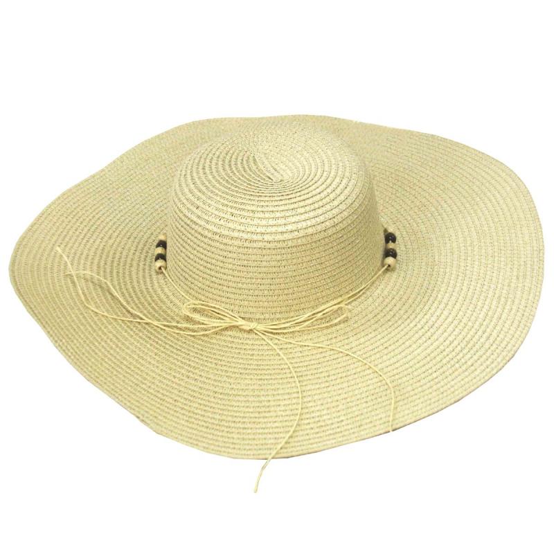 Sieviešu platmale krēmkrāsā ar dekoratīvu aukliņu un pērlītēm ir izcils vasaras aksesuārs, kas piešķir tēlam svaigumu un sievišķību. Platā mala nodrošina aizsardzību pret saules stariem, bet vieglais un elpojošais materiāls ļauj justies komfortabli arī karstākajās dienās. Stilīgais dizains ar krellītēm padara šo platmali piemērotu gan pludmales, gan pilsētas gaitām. Platmale izgatavota no izturīgas sintētiskās šķiedras, kas saglabā formu un ir viegli kopjama. Izmērs 58 cm.