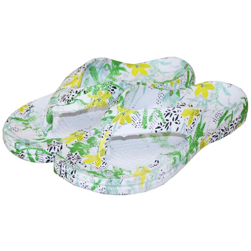 Baltas pludmales čības ar zaļiem un dzelteniem ziediem izgatavotas no EVA (etilēnvinilacetāta). EVA materiāla apavi ir lieliski piemēroti ikdienas darbiem un brīvā laika aktivitātēm. Tie ir īpaši viegli, mīksti, elastīgi, ērti, neslīdoši un viegli kopjami. Reljefā virsma iekšpusē pēdas zonā uzlabo asinsriti.36.