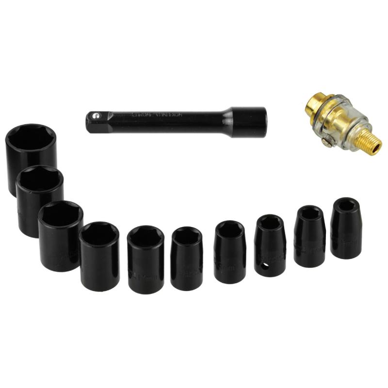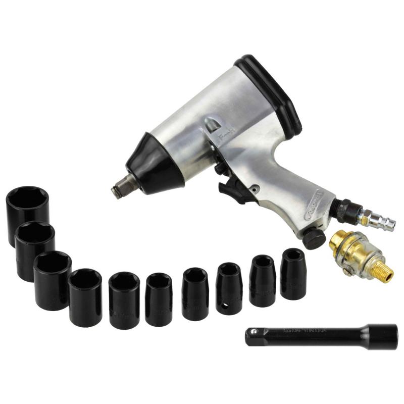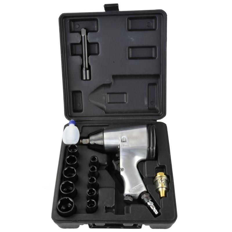1/2" pneimatiskā uzgriežņu atslēga komplektā ar uzgaļiem, dehidratoru, Allen atslēgu, eļļas rezervuāru un futlāri uzglabāšanai. Ērta, viegla un vienlaikus izturīga atslēga, ko plaši izmanto dažāda veida ierīču, automobiļu detaļu un citu ar skrūvēm nostiprinātu priekšmetu montāžas un demontāžas laikā. Komplektā iekļautie uzgaļi ir izgatavoti no CRV hroma-vanādija tērauda, kam raksturīga augsta izturība un izturība pret mehāniskiem bojājumiem. Uzgriežņu atslēgai ir 4 pakāpju griezes momenta regulēšana pievilkšanas laikā (griešanās pa labi) un atskrūvēšana (griešanās pa kreisi).