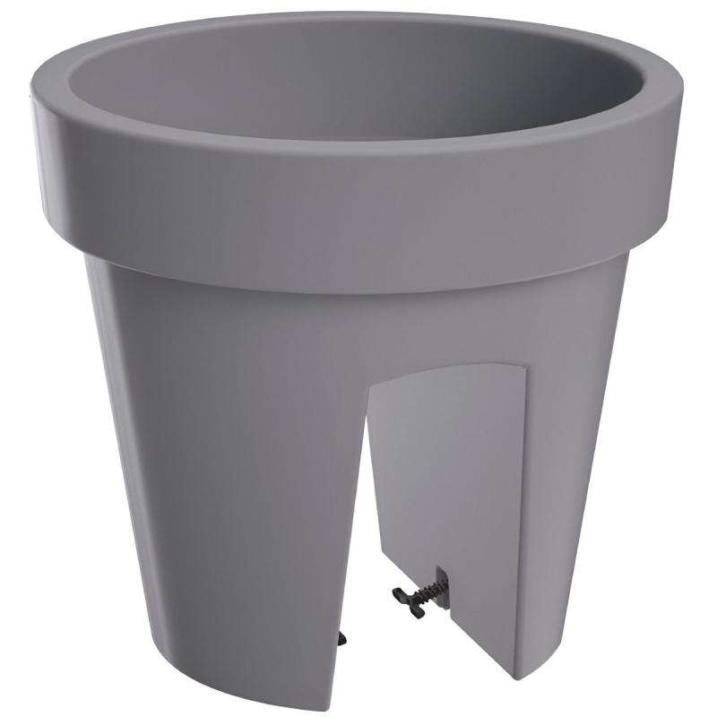 Pelēks puķu pods Lofly. Šis plastmasas dekoratīvais pods ir viegls, stabils, izturīgs pret skrāpējumiem un triecieniem. Puķu podu ir ļoti viegli piestiprināt pie margām, pateicoties padziļinājumam un īpašiem rokturiem. Aizņem vietu abās margu pusēs. Piemērots lietošanai gan iekštelpās, gan ārā. Izmērs (D x A) 24 x 22 cm.