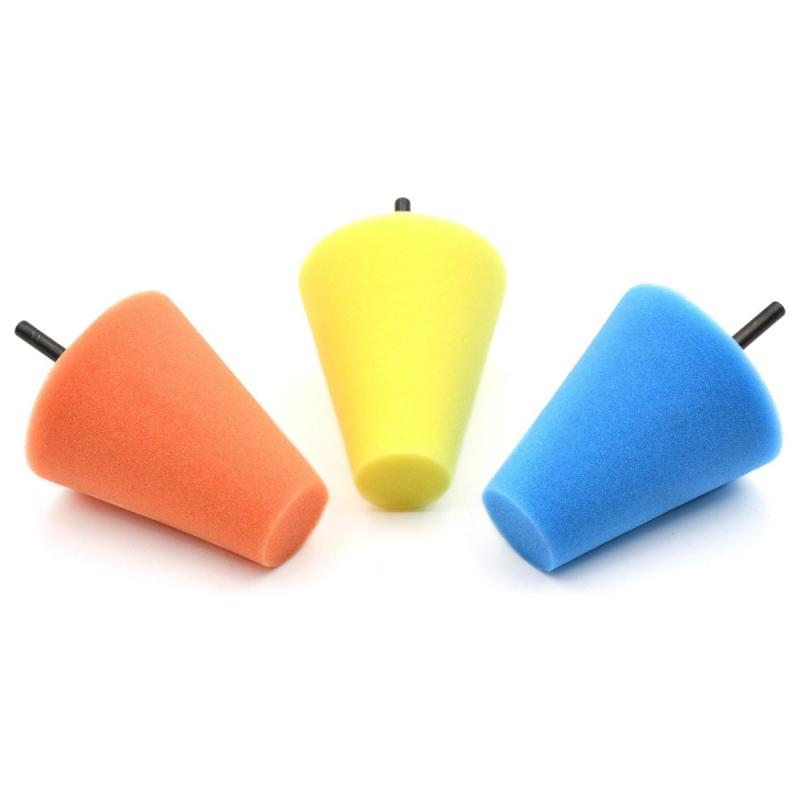 Pulēšanas uzgaļu komplekts ar 6 mm stiprinājuma kronšteinu urbjmašīnām un skrūvgriežiem. Lieliski piemēroti pulēšanai grūti sasniedzamās vietās un stūros. Izmērs (pamatne x garums x augšdaļa) 72 x 87 x 32 mm, kāta garums 28 mm. Maksimālais griešanās ātrums 5000 apgr./min. Cietība - dzeltenais T80, zilais T60, oranžais T40.