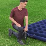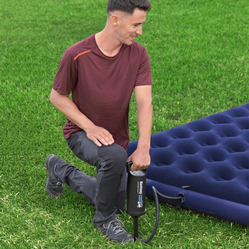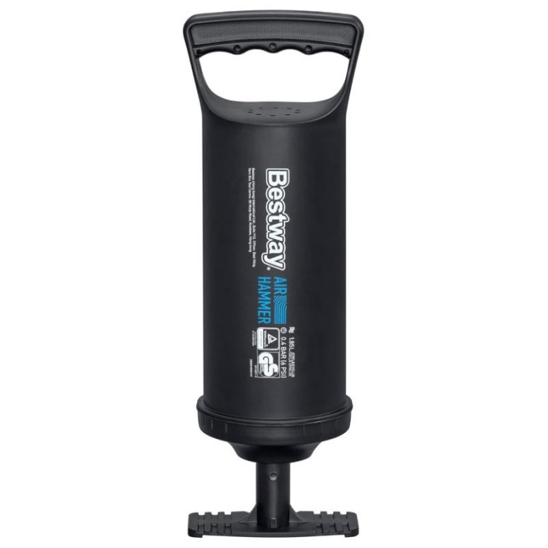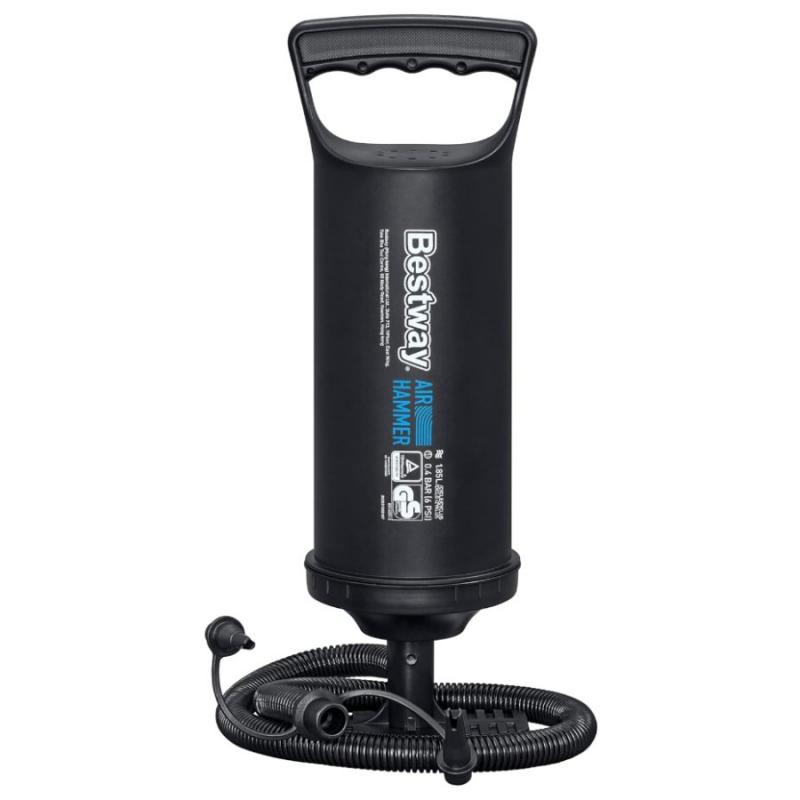 Bestway® Air Hammer™ rokas pumpis ir efektīvs instruments, lai ātri un viegli piepūstu dažādus produktus, piemēram, baseinus, gultas, laivas un piepūšamās rotaļlietas. Ar 1.85 litru sūkšanas tilpumu un divvirzienu sūkšanas funkciju (gaisa piepūšana gan uz augšu, gan uz leju) šis pumpis nodrošina ātru piepūšanu. Komplektā iekļauta elastīga šļūtene un trīs dažādi vārstu adapteri, kas ļauj izmantot pumpi dažādiem produktiem. Maksimālais spiediens ir 0.7 bar, kas nodrošina efektīvu piepūšanu. Tā kompaktais izmērs (35 cm garums) un vieglais svars (345 g) padara to viegli pārnēsājamu un uzglabājamu.