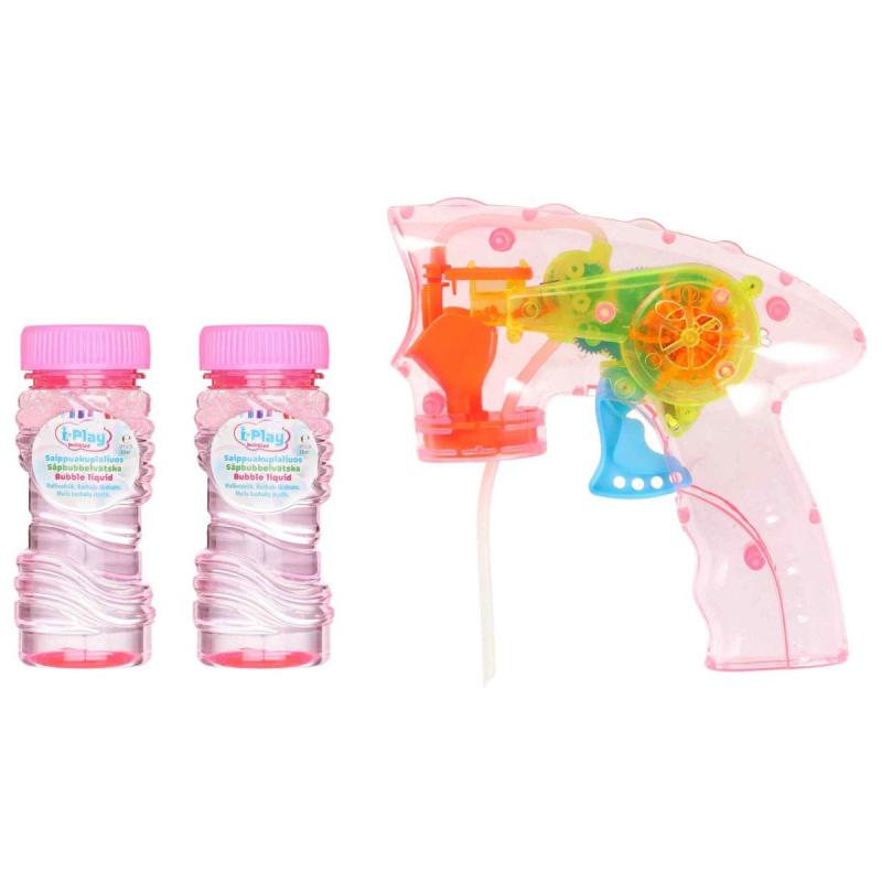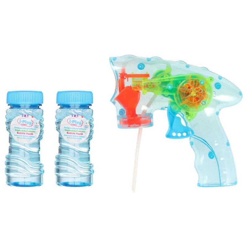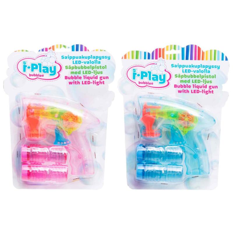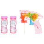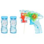 Burbuļu pūšamā pistole ar LED gaismiņu. Komplektā ietilpst burbuļpistole un divi burbuļu šķīdumi (2 x 53 ml). Darbojas ar L736/LR41 baterijām (iekļautas komplektā, nav maināmas). Piemērota bērniem no 5 gadu vecuma.