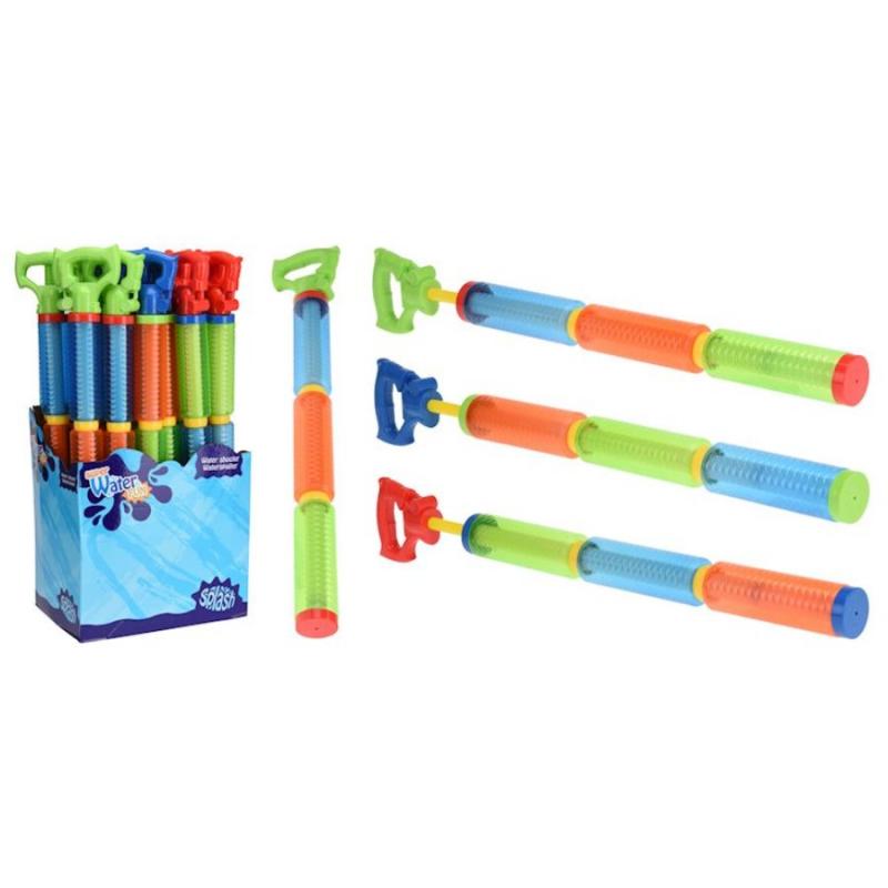 Liela izmēra ūdens šāvējs aktīvām vasaras ūdens kaujām dārzā, pludmalē vai pie baseina. Vienkāršais pumpja darbības princips ļauj bērniem ātri ievilkt ūdeni un izšaut garu, spēcīgu ūdens strūklu, veicinot kustību aktivitāti un jautras spēles svaigā gaisā. Garais korpuss nodrošina lielu ūdens tilpumu un ļauj ilgāk spēlēties bez biežas uzpildes, savukārt vieglā plastmasas konstrukcija ir ērti turama arī jaunākiem bērniem. Rotaļlieta ir ideāli piemērota grupu spēlēm un ūdens cīņām ar draugiem vai ģimeni. Garums 60 cm.