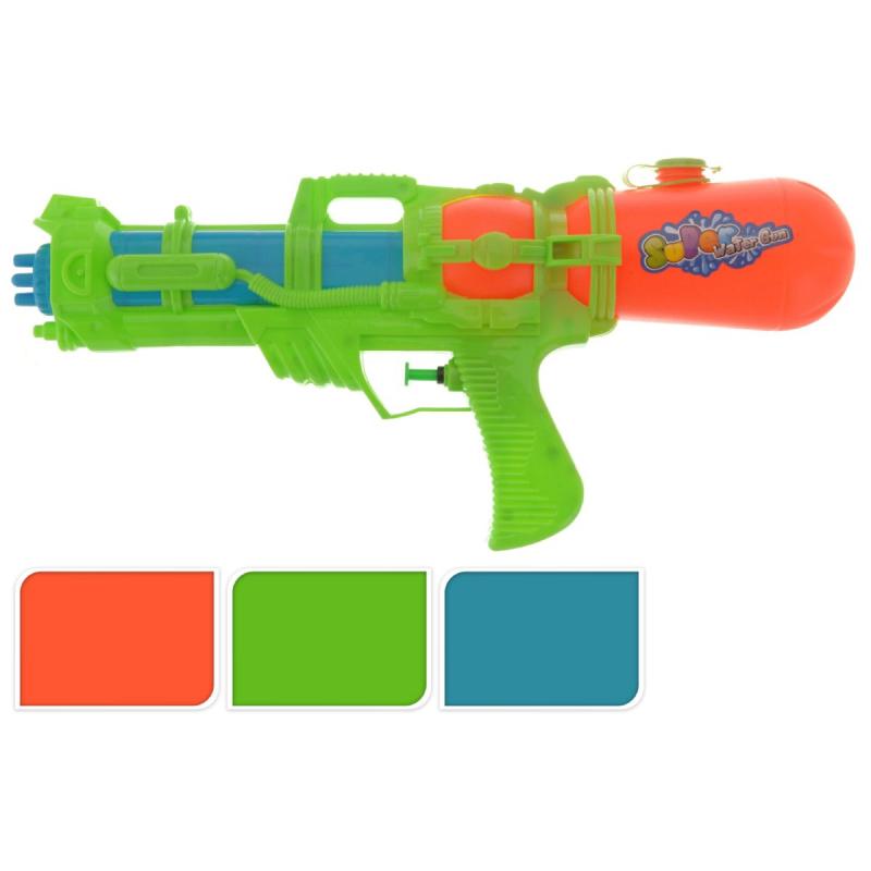 Vidēja izmēra ūdens pistole jautrām vasaras spēlēm dārzā, pludmalē vai pie baseina. Ietilpīgais rezervuārs ļauj izšaut spēcīgu ūdens strūklu un baudīt dinamiskas ūdens kaujas ar draugiem un ģimeni. Ergonomiskais rokturis un vieglā plastmasas konstrukcija nodrošina ērtu satvērienu un drošu lietošanu bērniem, vienlaikus attīstot roku veiklību un koordināciju. Rotaļlieta ir piemērota biežai lietošanai svaigā gaisā un viegli uzpildāma ar ūdeni, kas padara to par lielisku izvēli aktīvai atpūtai. Garums 37 cm.