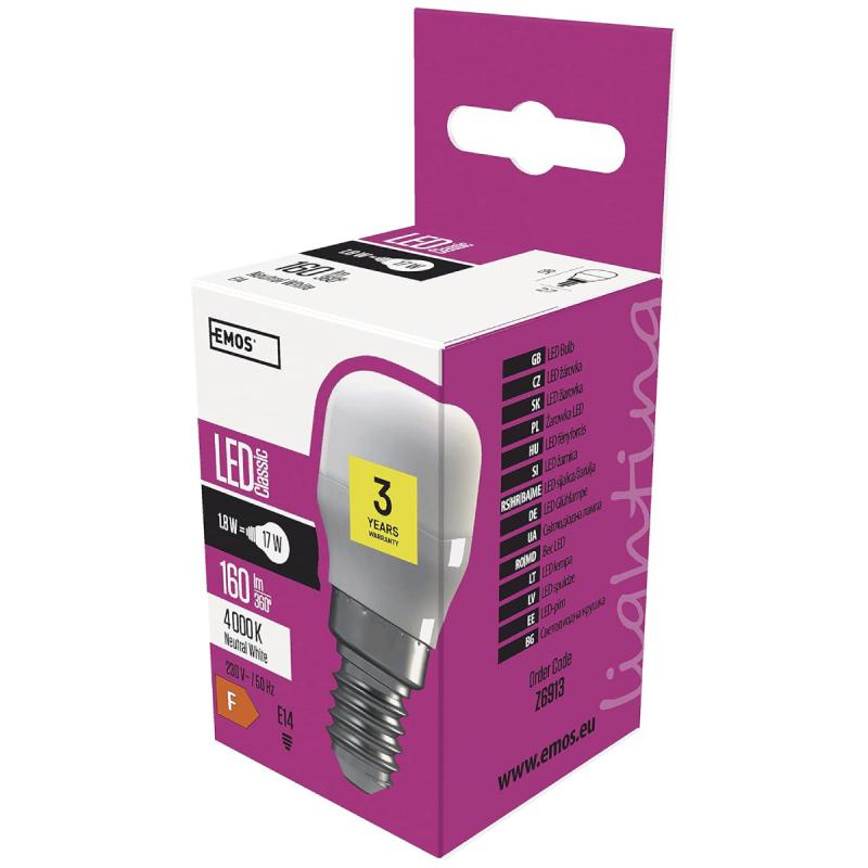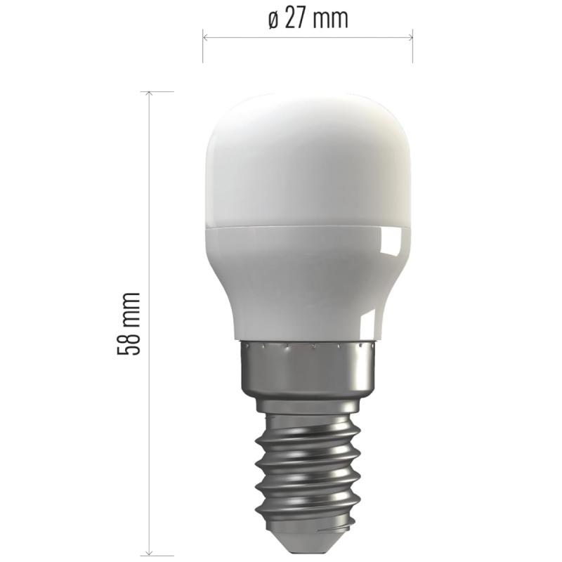 EMOS T28 cilindra formas LED spuldze ar E14 ligzdu izstaro neitrāli baltu gaismu, kas piemērota dažādiem gaismas ķermeņiem. Tās gaismas plūsma ir 160 lūmeni un enerģijas patēriņš ir 1.8 W. Tā sniedz spilgtumu, kas atbilst 17 W kvēlspuldzei. Matētais pārklājums palīdz vienmērīgi izkliedēt gaismu, samazinot atspīdumu. Spuldzes izmērs (D x A) 27 x 58 mm.
