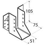 Standarta siju piekares elementi, kas nodrošina montāžu bez atstarpes starp savienotajiem elementiem. Papildu lielais atvēruma diametrs padara tos izmantojamus siju stiprināšanai pie betona sienas. Izgatavots no cinkota tērauda DX51D + Z275, biezums 2 mm. Piemērotie stiprinājumi - galdniecības enkurnaglas ø 4 mm, kokskrūves ø 10 mm, skrūves M10, betona enkuri M10. Nestspēja un noturība 19 kN. Izmērs 75 x 51 x 105 x 2 mm.