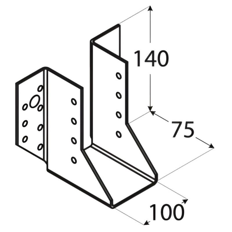 Standarta siju piekares elementi, kas nodrošina montāžu bez atstarpes starp savienotajiem elementiem. Papildu lielais atvēruma diametrs padara tos izmantojamus siju stiprināšanai pie betona sienas. Izgatavots no cinkota tērauda DX51D + Z275, biezums 2 mm. Piemērotie stiprinājumi - galdniecības enkurnaglas ø 4 mm, kokskrūves ø 10 mm, skrūves M10, betona enkuri M10. Nestspēja un noturība 25.45 kN. Izmērs 75 x 100 x 140 x 2 mm.