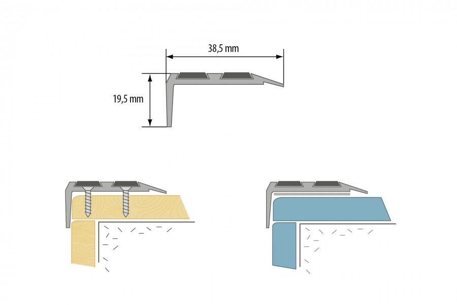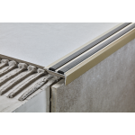 Stūra kāpņu profils aizsargā pakāpienu malas no mehāniskiem bojājumiem. Profila augšpusē novietotā pretslīdes gumija nodrošina labu saķeri un samazina paslīdēšanas risku. Profilu var piestiprināt, izmantojot skrūves, montāžas līmi vai līmlentu. Izgatavots no alumīnija. Krāsa - zelta. Izmērs (G x P x A) 1000 x 38.5 x 19.5 mm.