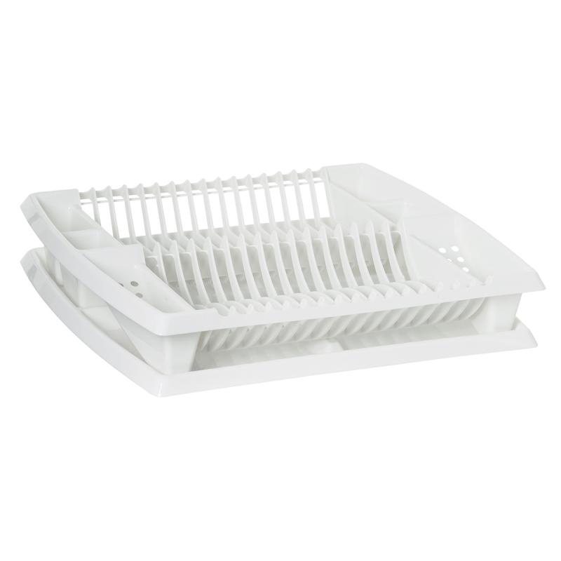 Balts trauku žāvētājs ar statīviem šķīvjiem un vietām vertikāli novietotiem galda piederumiem. Paplāte zem žāvētāja noteces savāc lieko ūdeni. Produkts ir pārstrādājams, un to var ievietot cietās plastmasas atkritumu tvertnēs. Tas ir izgatavots no PP (polipropēna). Izmērs 442 x 383 x 85 mm.