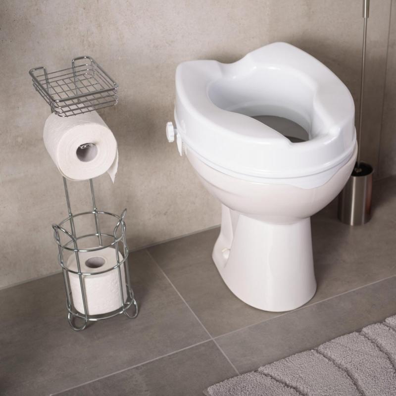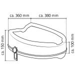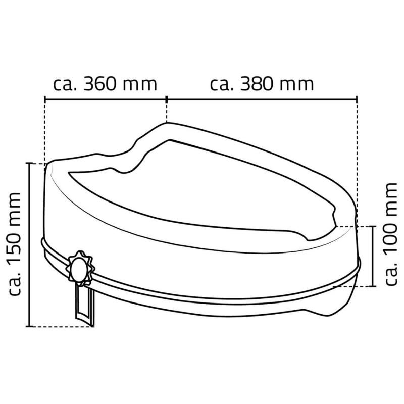 Paaugstināts tualetes poda sēdeklis ievērojami atvieglo sēdēšanu un piecelšanos. Piemērots visiem standarta tualetes podiem. Papildus ērtībai izgriezumi priekšpusē un aizmugurē. Stiprināšana bez eņģēm ar sānu regulēšanas skrūvēm. Izgatavots no polipropilēna (PP). Maksimālais lietotāja ķermeņa svars 150 kg. Izmērs 38 x 36 x 10 cm.