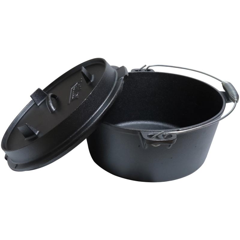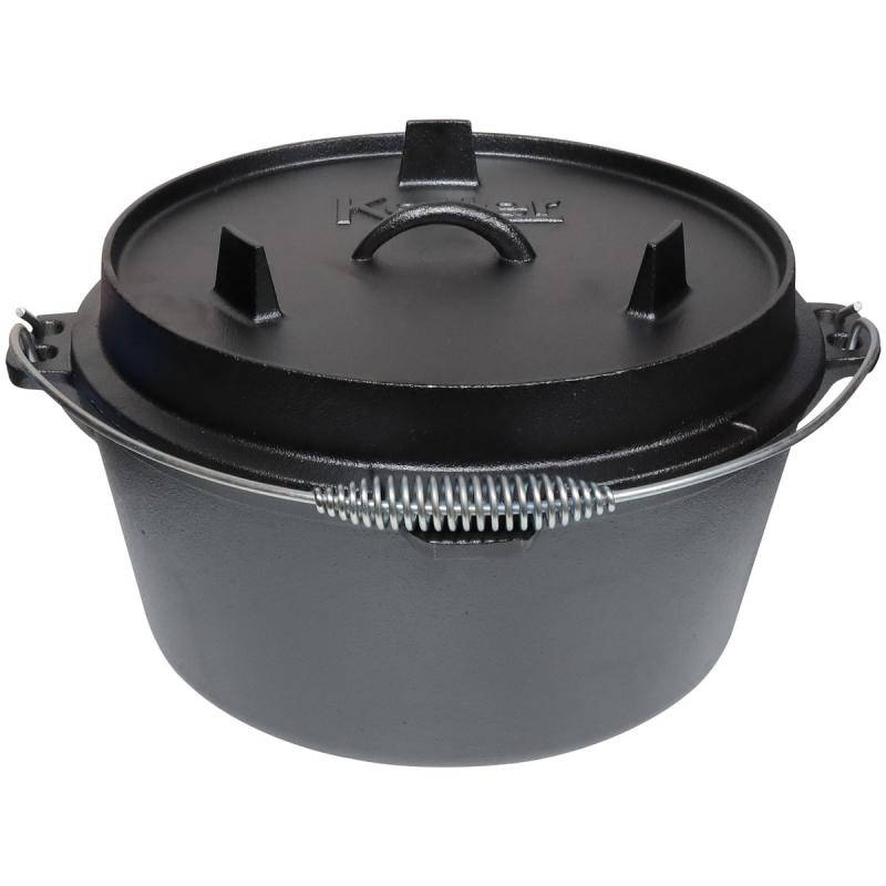 Čuguna katls ar vāku. Paredzēts ēdienu gatavošanai uz uguns vai grila. Pateicoties biezajām sienām spēj uzturēt lielu karstumu ilgu laika un to vienmērīgi izplatīt. Vāks ar paaugstinātām malām ogļu novietošanai, nodrošina, ka šo katlu var izmantot visu veidu gatavošanai, sākot no cepeša līdz kūkām, cepumiem un maizei. Čuguna trauki ir ilgmūžīgi, izturīgi pret sadegšanu, mehāniskiem bojājumiem, nepakļaujas deformācijai un ir nekaitīgi cilvēkam. Katla tilpums 13 l, diametrs 37 cm, augstums 13.6 cm, svars 12.8 kg.