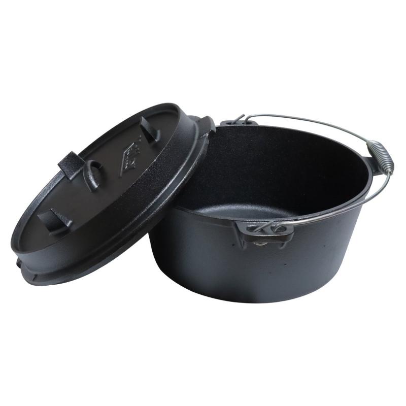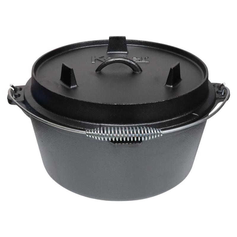 Čuguna katls ar vāku. Paredzēts ēdienu gatavošanai uz uguns vai grila. Pateicoties biezajām sienām spēj uzturēt lielu karstumu ilgu laika un to vienmērīgi izplatīt. Vāks ar paaugstinātām malām ogļu novietošanai, nodrošina, ka šo katlu var izmantot visu veidu gatavošanai, sākot no cepeša līdz kūkām, cepumiem un maizei. Čuguna trauki ir ilgmūžīgi, izturīgi pret sadegšanu, mehāniskiem bojājumiem, nepakļaujas deformācijai un ir nekaitīgi cilvēkam. Katla tilpums 7 l, diametrs 30.9 cm, augstums 10 cm, svars 7.8 kg.